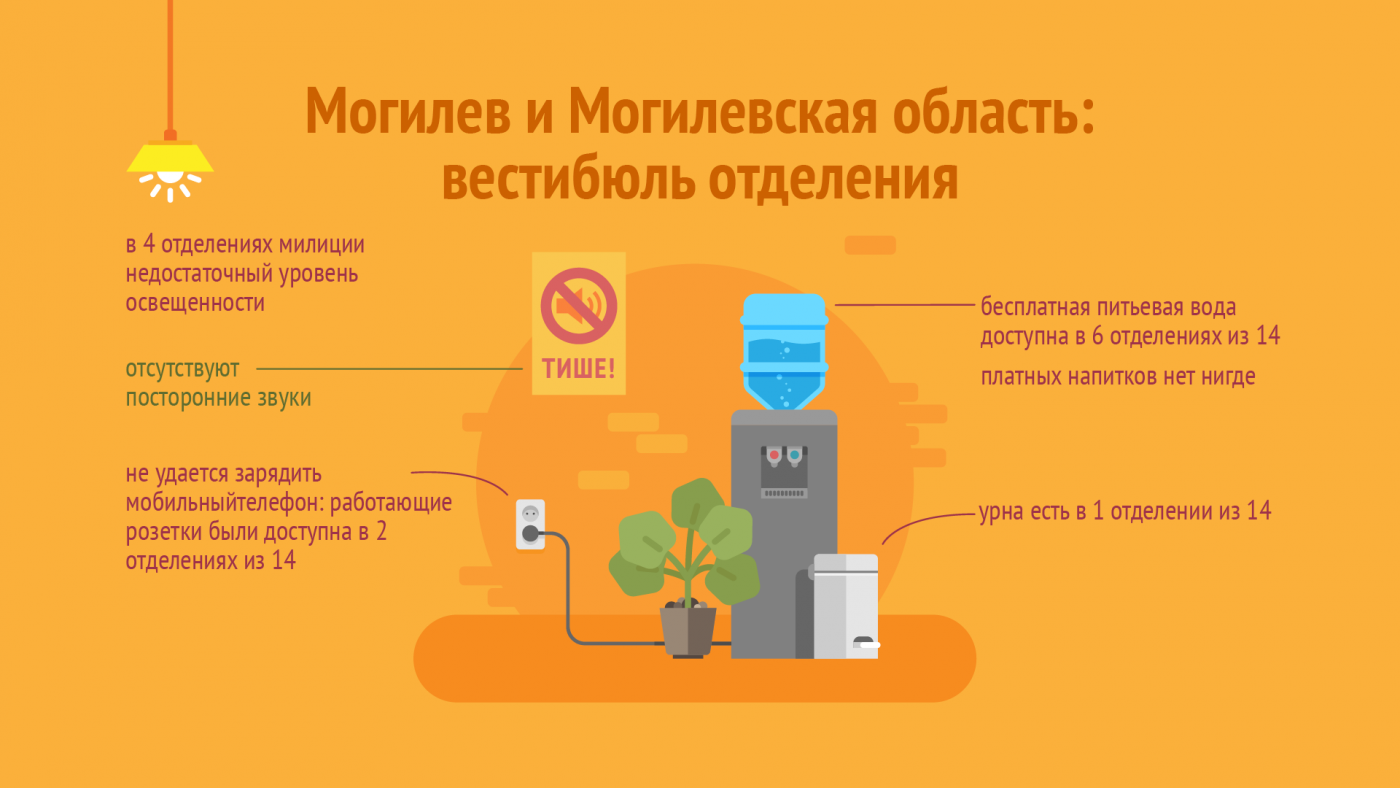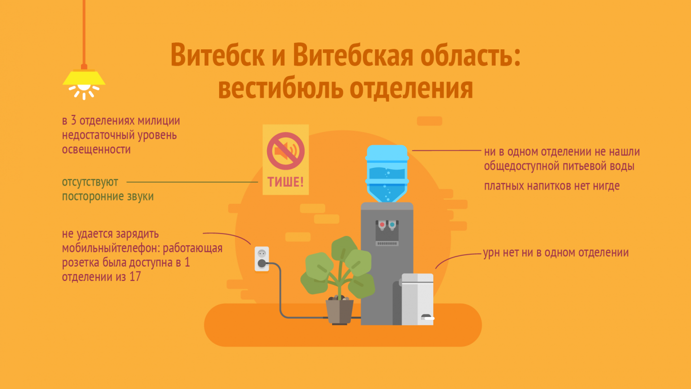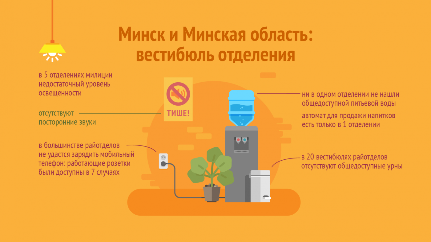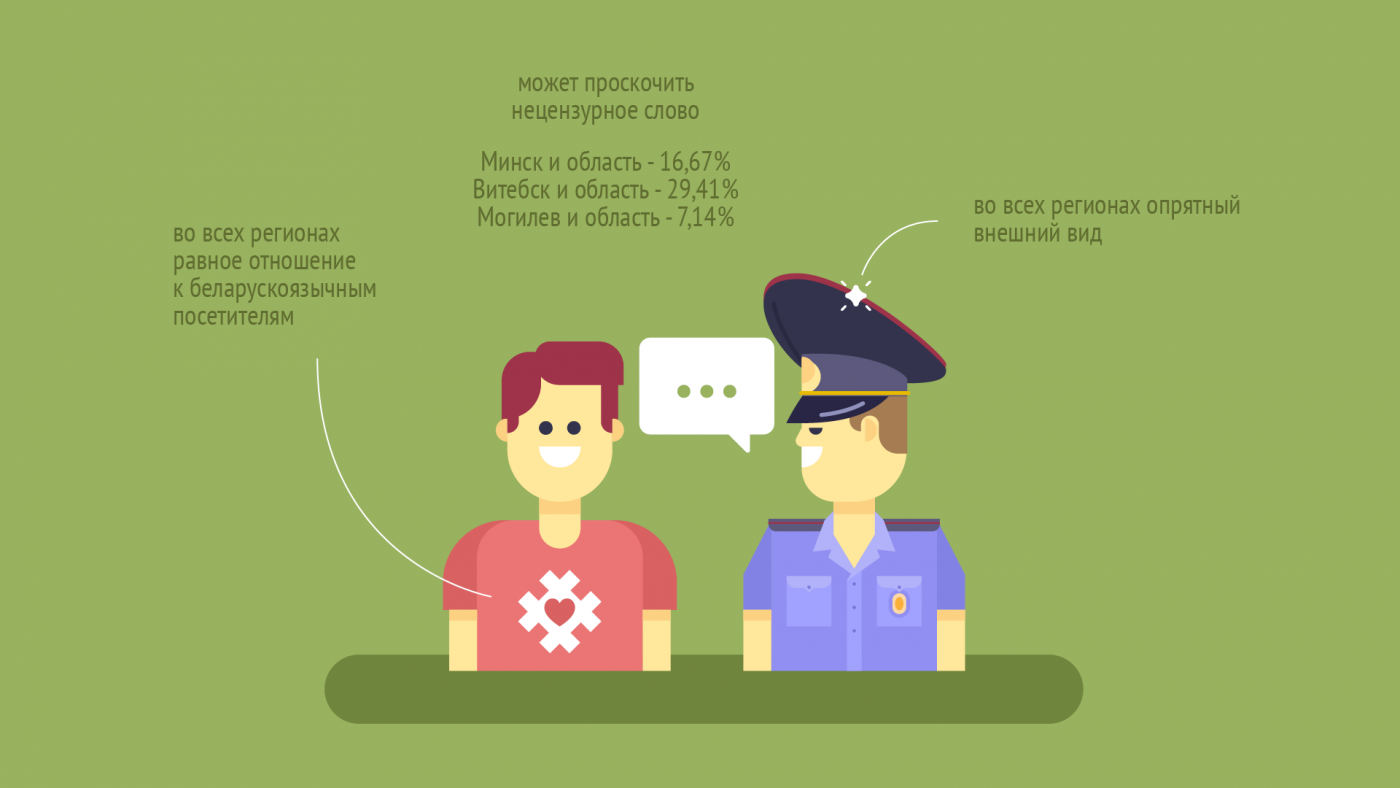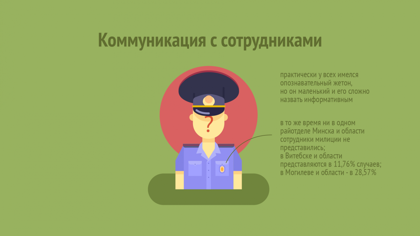 Другі фокус - умовы працы саміх супрацоўнікаў міліцыі: як праходзіць камунікацыя старэйшых і малодшых чыноў, як да супрацоўнікаў ставяцца наведвальнікі, ці ёсць побач з месцам працы пункт гарачага харчавання, умовы у прыбіральнях і г.д.