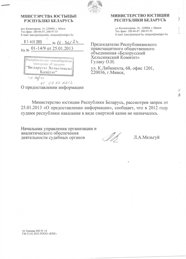 Такое паведамленне Мінюст скіраваў у адказ на зварот РПГА «Беларускі Хельсінкскі Камітэт». З пачатку 2000-х у Беларусі штогод выносілася ад 2 да 9 смяротных прысудаў. Вядома, што агулам у 2011 годзе 3 чалавекі былі асуджаныя на смяротнае пакаранне. Такія звесткі прадставіла Міністэрства юстыцыі напрыканцы мінулага года.