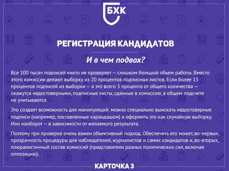 Напоминаем, что ранее мы рассказывали, что во время выборов делают избирательные комиссии, кто за что отвечает, как попасть в состав и, наконец, зачем это все нужно; а также - как устроен процесс сбора подписей по выдвижению кандидатами. Платят ли за сбор подписей, можно ли собирать подписи самостоятельно, зачем нужны инициативные группы.