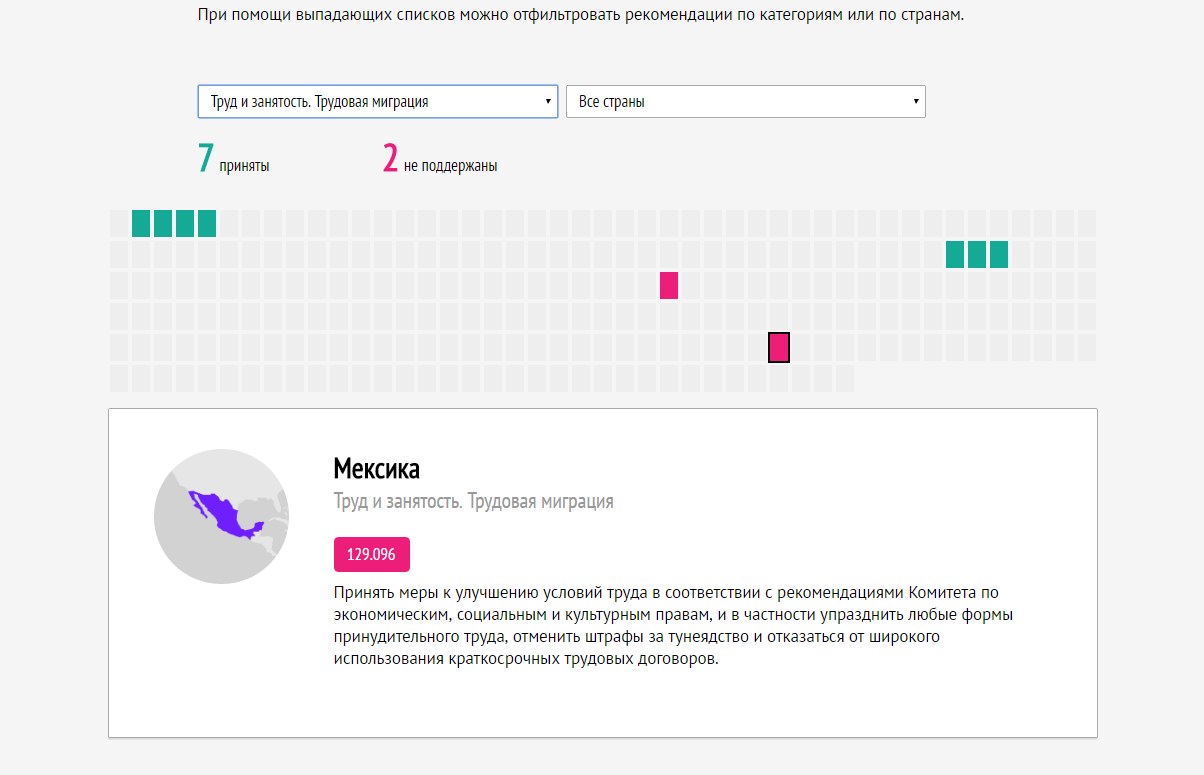 Среди них, например: «рассмотреть вопрос о создании национального правозащитного учреждения» от Зимбабве, «оказывать поддержку институту традиционной семьи» от России или «продолжать совершенствовать великолепную систему социальной защиты» от Венесуэлы.